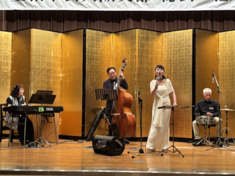 懇親会では、平成14年に開催された第30周年記念懇親会のビデオ上映のあと、今回のメインイベントであります「ならまちブルーノート」の方々によるジャズ演奏をしていただきました(写真)。奈良高校卒業生もしくは元教員の方4名で、10曲披露いただき、さすがプロという演奏と美声で会場は華やかになり、アンコールが出るほどでした。